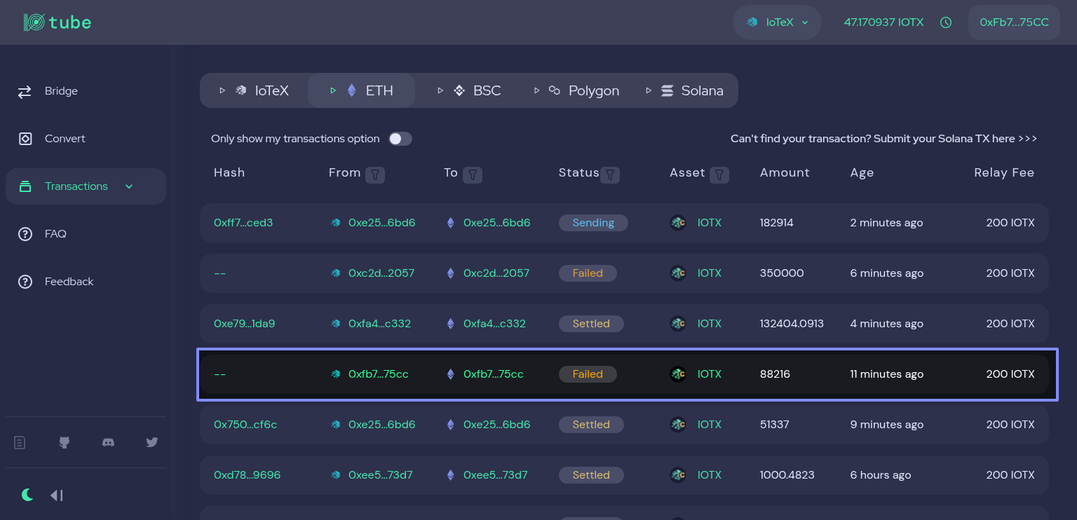 My bridge transaction of CIOTX tokens from IOTX to Ethereum appears as failed in the explorer.